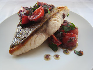 A piquant salad of cherry tomatoes, black olive tapanade, chilli and parsley is a perfect and simple accompaniment for crisp pan-fried kingfish fillets.