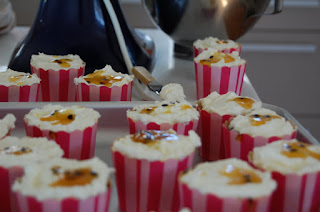 Divide the icing amongst the cool cakes and drizzle with ½ teaspoon of passionfruit syrup.