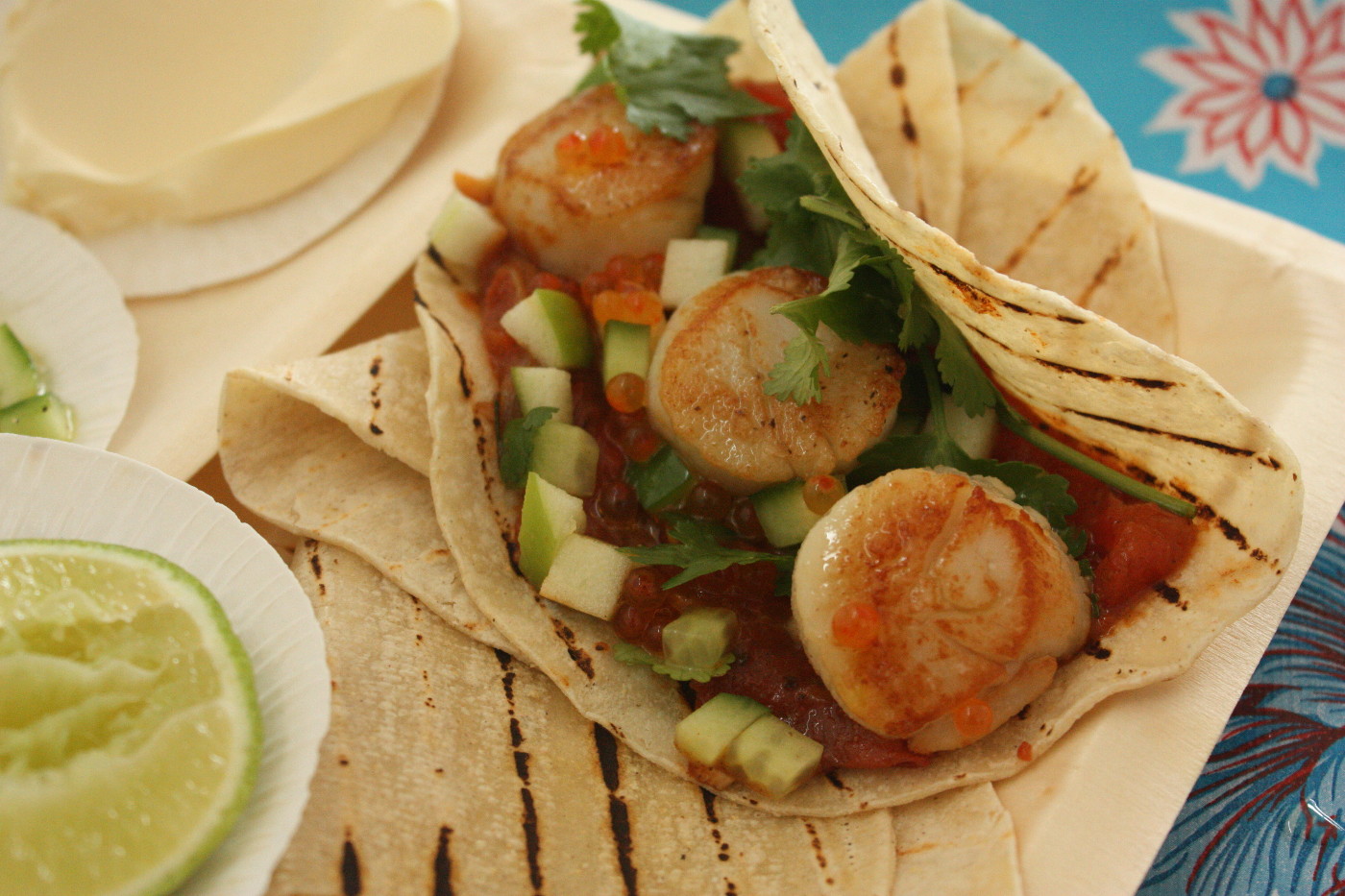 To serve spread a little tomato on the base of each taco. Divide the scallops on top. Garnish with cucumber and apple salsa, crème fraiche and salmon roe.